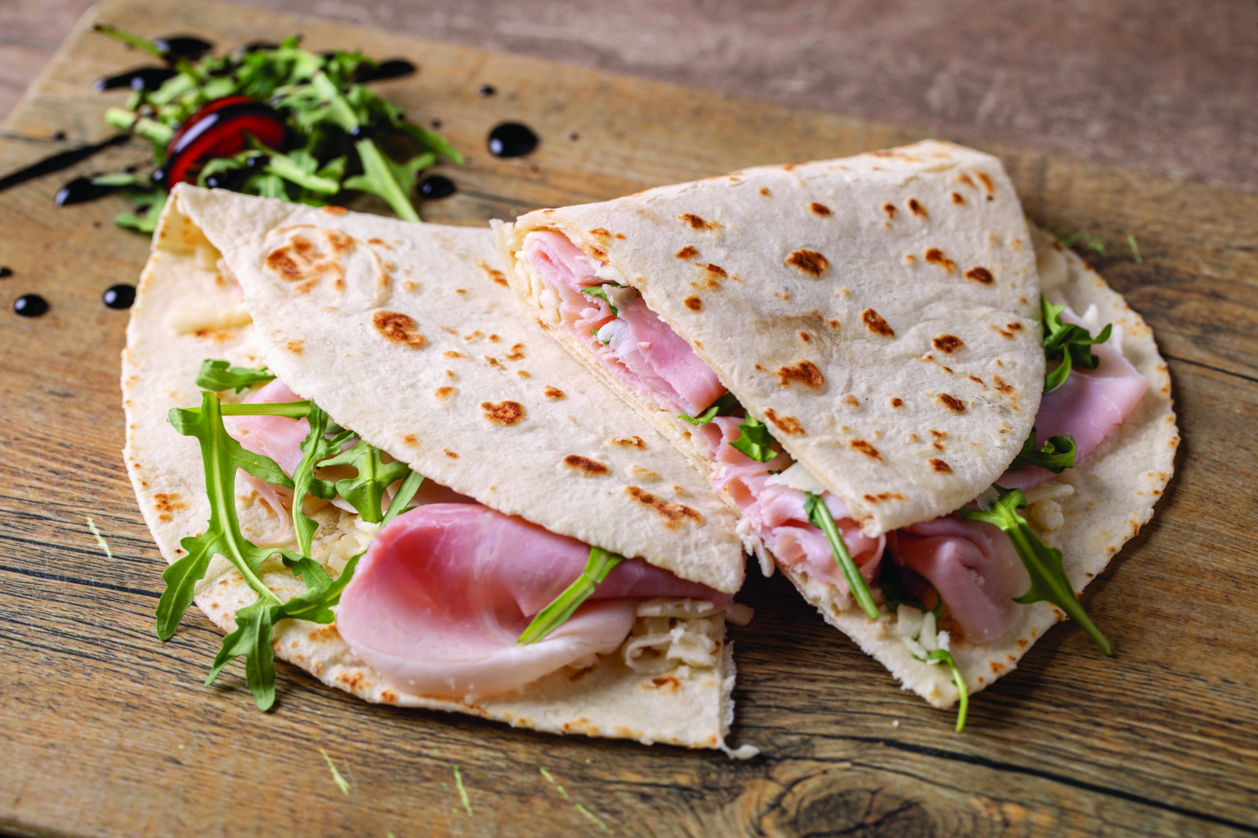Piadina is a soft flatbread from Emilia-Romagna made from unleavened dough that is cooked on a flat griddle pan. It is sold in piadina kiosks, called piadinerie, where it is eaten fresh from the pan, filled with meat or cheese.