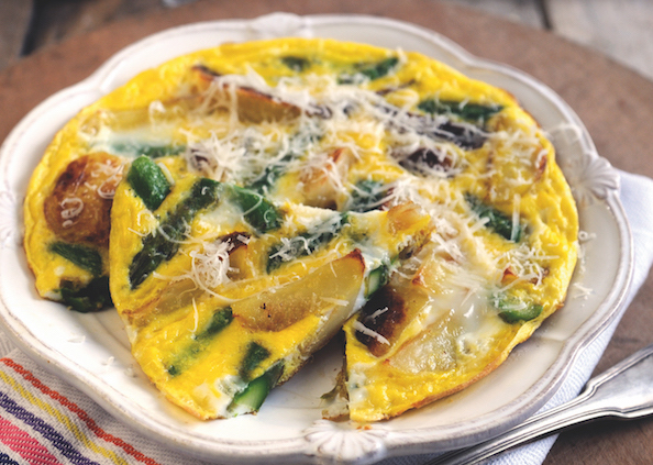 This Italian omelette recipe from Mario Matassa uses asparagus, potatoes and cheese, but the beauty of the dish is that you can include pretty much any ingredients you fancy…