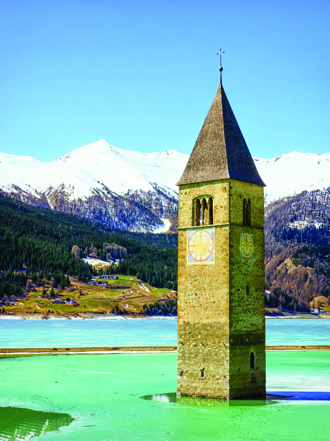 This fabulous vista on the Italian border with Austria has a past hidden underwater. The only giveaway is the top half of the bell tower poking out from the lake – it is the only visible remaining structure from the town of Curon Venosta in the region of South Tyrol which was sacrificed in order to build a dam and artificially unify two natural lakes high up in the alps. Prior to the creation of Lago di Resia this land was dotted with 163 homes and 1,290 acres of cultivated land. The original town had to be abandoned when the dam was completed in 1950 and now lies completely submerged, with the exception of the ancient bell tower which has become a landmark, and is even featured on the coat of arms of the new town which was rebuilt on the shores of the lake. The tower is still accessible on foot when the water freezes. Legend says that you can hear church bells ring during the winter; an unlikely story considering the bells were removed prior to the demolition of the church nave!